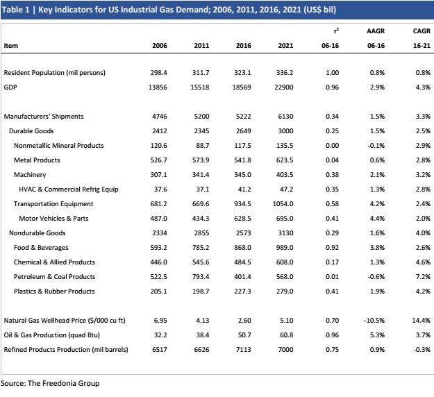 表1 | 美国工业气体需求的关键指标; 2006年,2011年,2016年,2021年(美元)