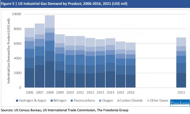 美国对氢和氩的需求一起考虑,预计到2021年每年将增长2.5%,达到20亿美元。氢销售的进步将反映化学产品制造的持续增长。供应商也将对氩气的需求增加,因为扩大金属产量将增加收益。