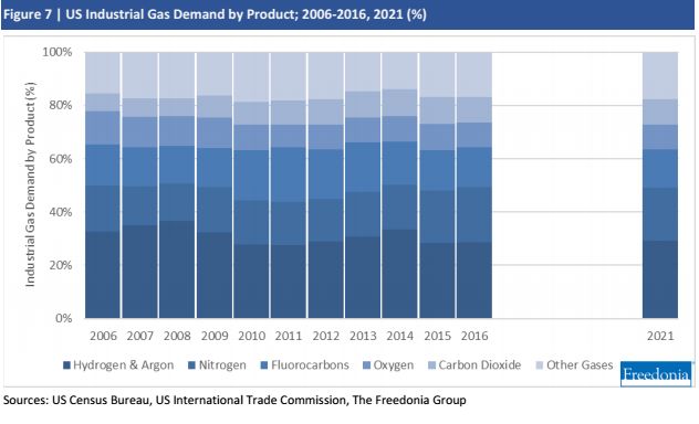 图7 | 美国工业气体产品需求量; 2006-2016,2021(%)