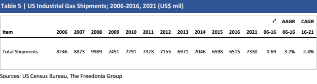 表5 | 美国工业气体出货; 2006-2016,2021(美元)